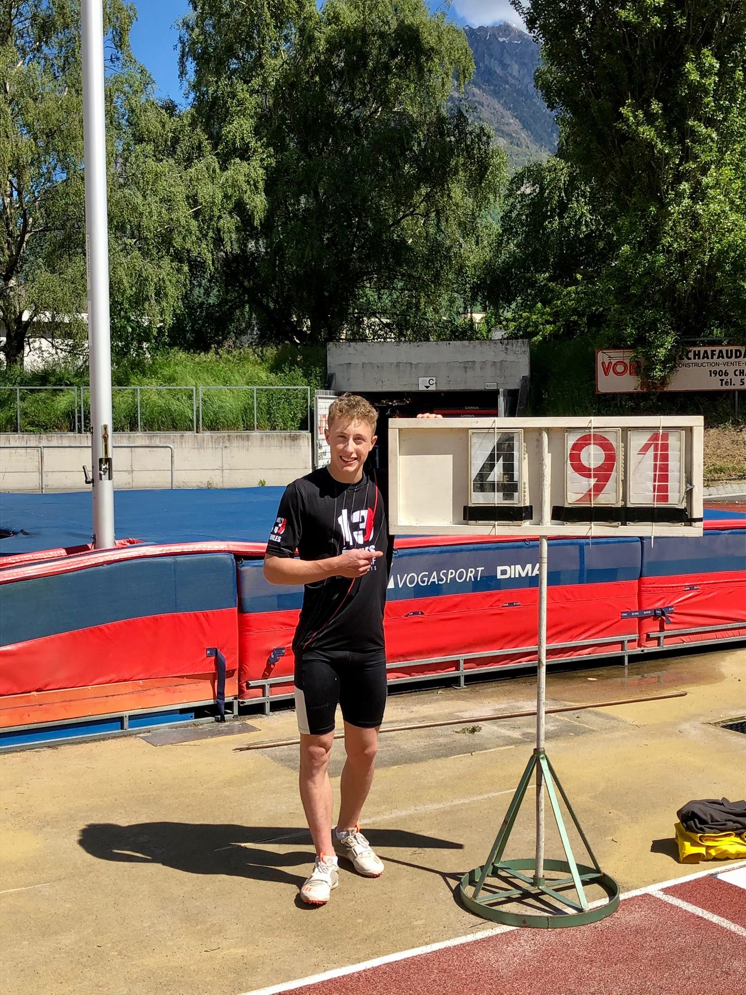 23 mai 2021 Dans le cadre d’un meeting organisé par le CABV Martigny, Justin Fournier a établi un nouveau record valaisan (toutes catégories) et suisse (catégorie moins de 18 ans) en saut à la perche, soit 4.91 mètres. Justin a passé une barre 31 cm plus haute que son ancienne marque à 4.60 mètres. Pour l’anecdote, à relever que l’ancien record valaisan (toutes catégories) étaient codétenu depuis le début mai 2021 seulement par un autre collègue du club, Valentin Imsand, qui avait réalisé un saut à 4.90 mètres. Félicitations à nos jeunes et à leur encadrement assuré par la famille Zengaffinen.