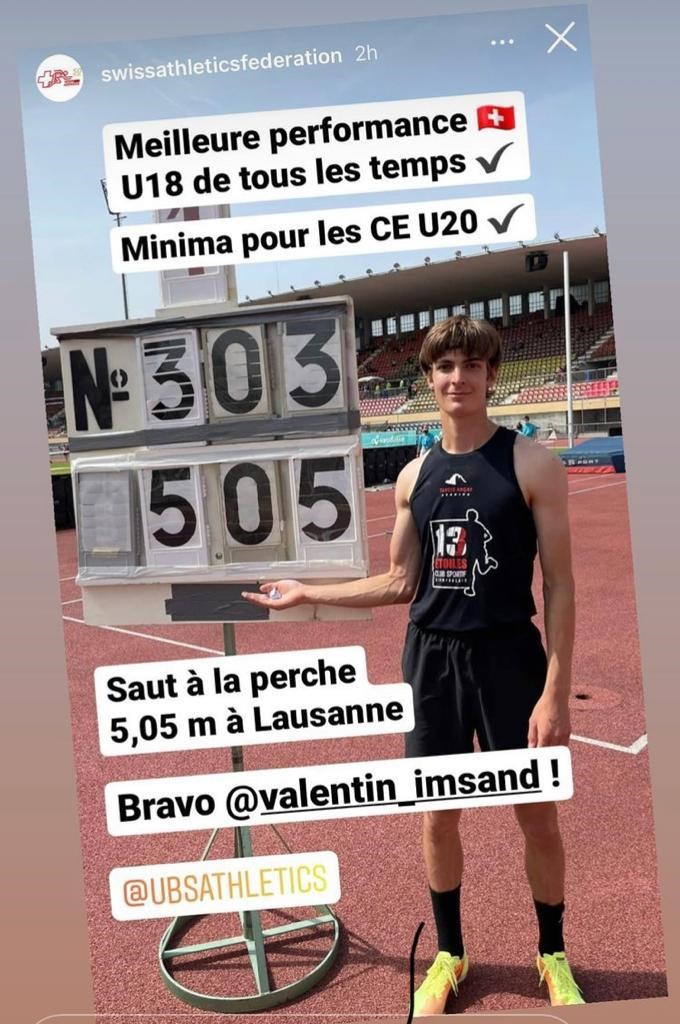 19 juin 2021 Lors d’un meeting à Lausanne, Valentin Imsand a battu le record de son collègue de club Justin Fournier de 5 cm pour établir le nouveau record valaisan (toutes catégories) et le record suisse (-18 ans) à 5.05 mètres. Valentin a ainsi réussi les minima pour les Championnats d’Europe (- 20 ans).