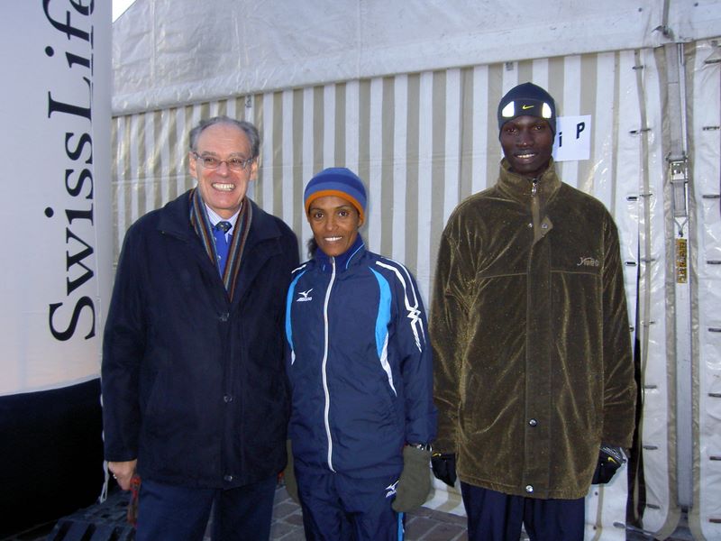 Derartu Tulu et Titus Mbishei en compagnie de Dominique Favre, Président du comité de la course Titzé de Noël